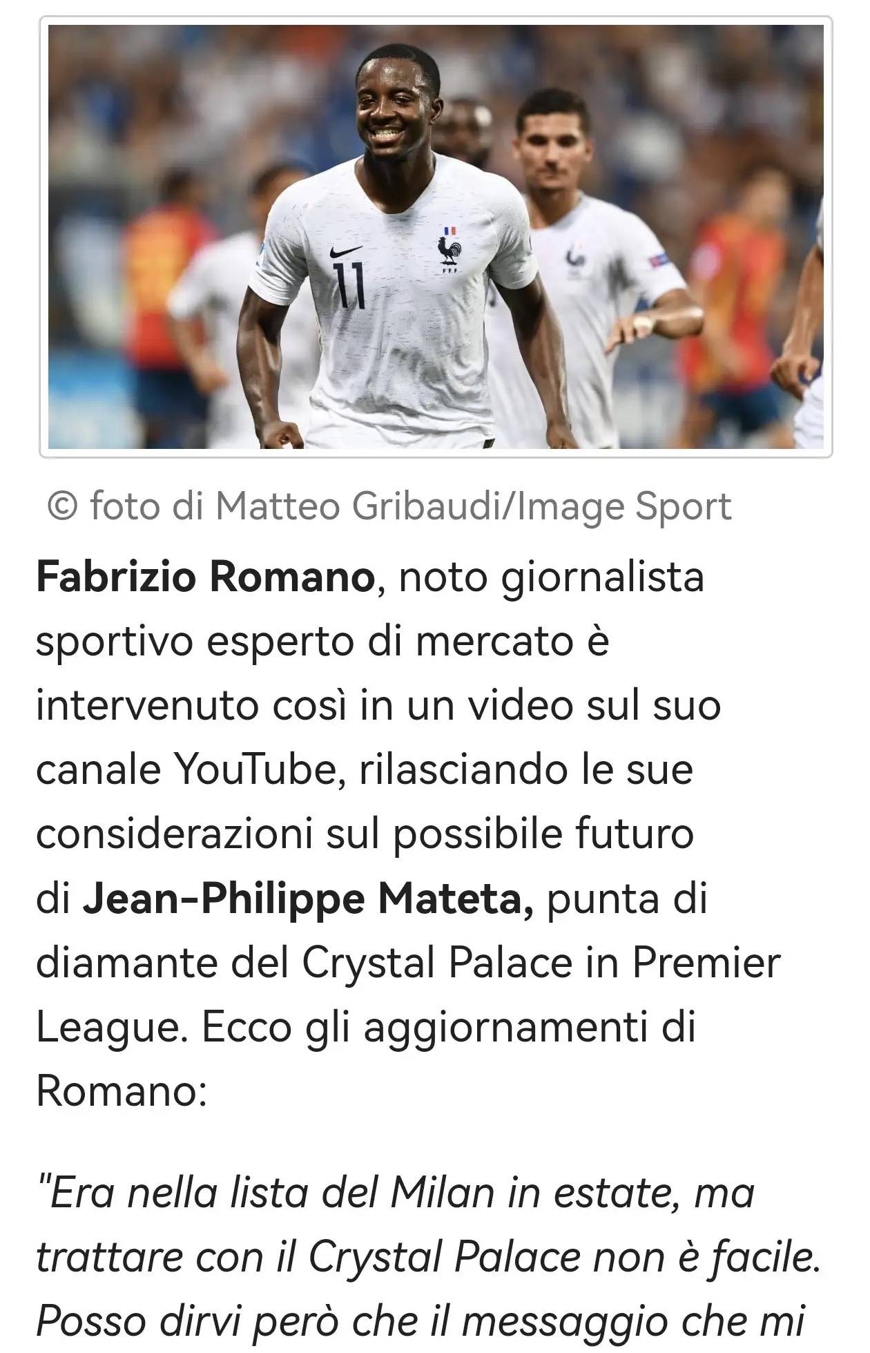 ฟาบริซิโอ โรมาโน่ นักข่าวชื่อดังด้านกีฬาและผู้เชี่ยวชาญด้านการย้ายทีม ได้แบ่งปันมุมมองของเขาเกี่ยวกับอนาคตของดาวรุ่งในแนวรุกของคริสตัล พาเลซ ฌอง-ฟิลิปป์ มาเตต้า ในวิดีโอทางช่อง YouTube ของเขา: