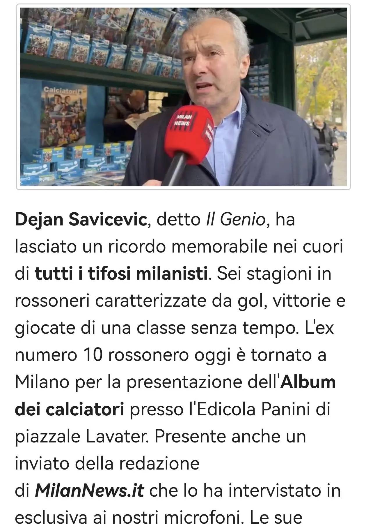 เดยัน ซาวิชเซวิช ผู้ได้รับการยกย่องว่าเป็น 'อัจฉริยะ' ได้ทิ้งร่องรอยอันลบเลือนไว้ในหัวใจของแฟนบอลมิลานทุกคน การสวมเสื้อสีแดงดำของรอสโซเนรีเป็นเวลาหกฤดูกาล เขาได้สร้างตำนานผ่านประตูชัย ความสำเร็จ และผลงานชิ้นเอกอันไร้กาลเวลา อดีตหมายเลข 10 ของมิลานได้กลับมาที่มิลานในวันนี้เพื่อสัมภาษณ์พิเศษกับ MN: