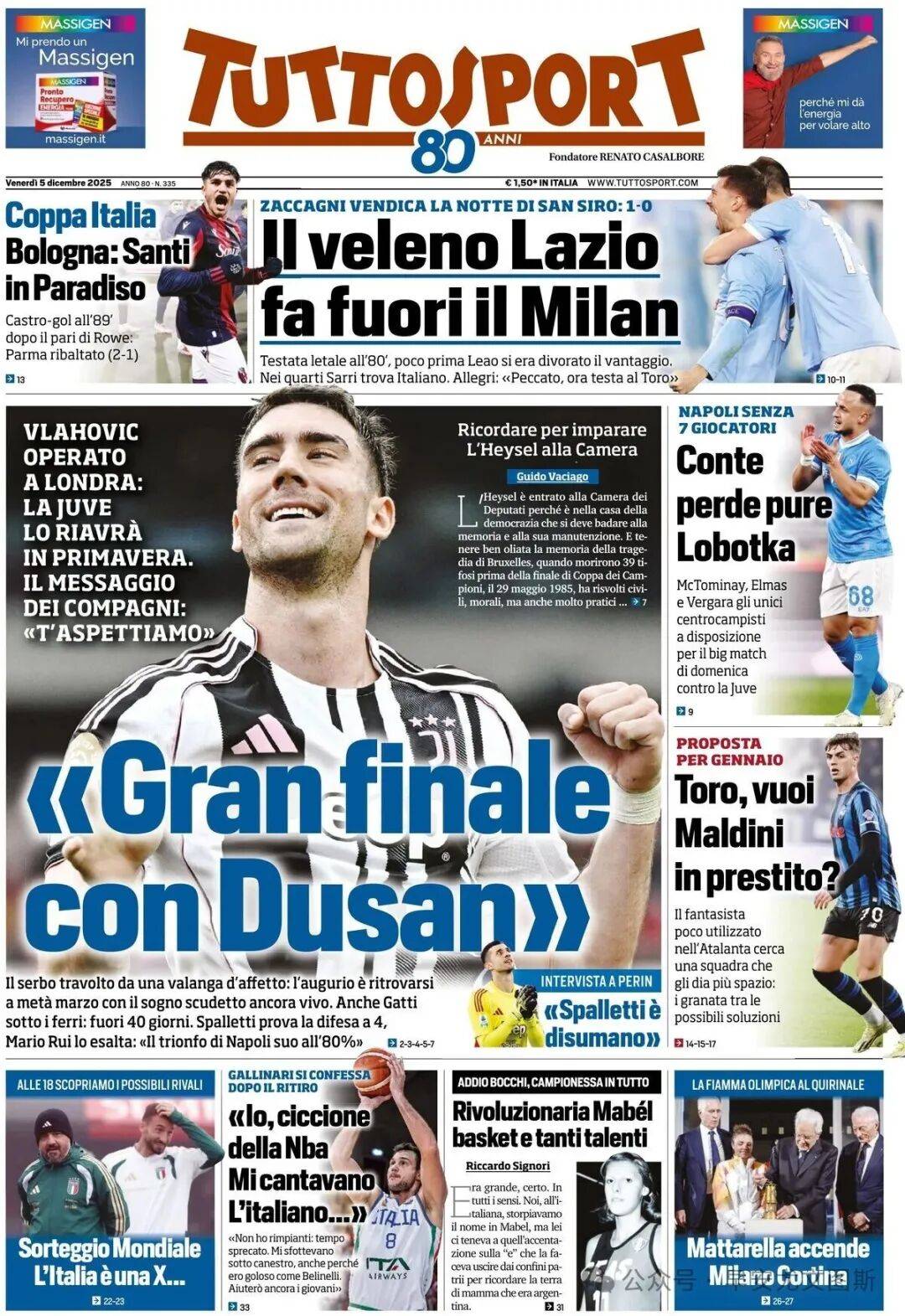 1. "การเผชิญหน้าครั้งสุดท้ายอันยิ่งใหญ่เคียงข้างดูซาน" วลาโฮวิชเข้ารับการผ่าตัดที่ลอนดอน: ยูเวนตุสจะต้อนรับการกลับมาของเขาในฤดูใบไม้ผลิ พร้อมด้วยข้อความจากเพื่อนร่วมทีม: "เราจะรอคุณอยู่"นักเตะชาวเซอร์เบียรู้สึกซาบซึ้งใจอย่างมาก โดยหวังว่าจะรักษาความหวังในการคว้าแชมป์เซเรียอาไว้ได้เมื่อกลับมาในเดือนมีนาคมกัตติก็เข้ารับการผ่าตัดเช่นกัน; สปัลเล็ตติทดลองใช้แผงหลังสี่คน;มาริโอ รุย ยกย่องเขา: "ชัยชนะในเนเปิลส์ 80% เป็นของเขา" การให้สัมภาษณ์ของเปริน: "สปัลเล็ตติไม่ใช่คนธรรมดา"