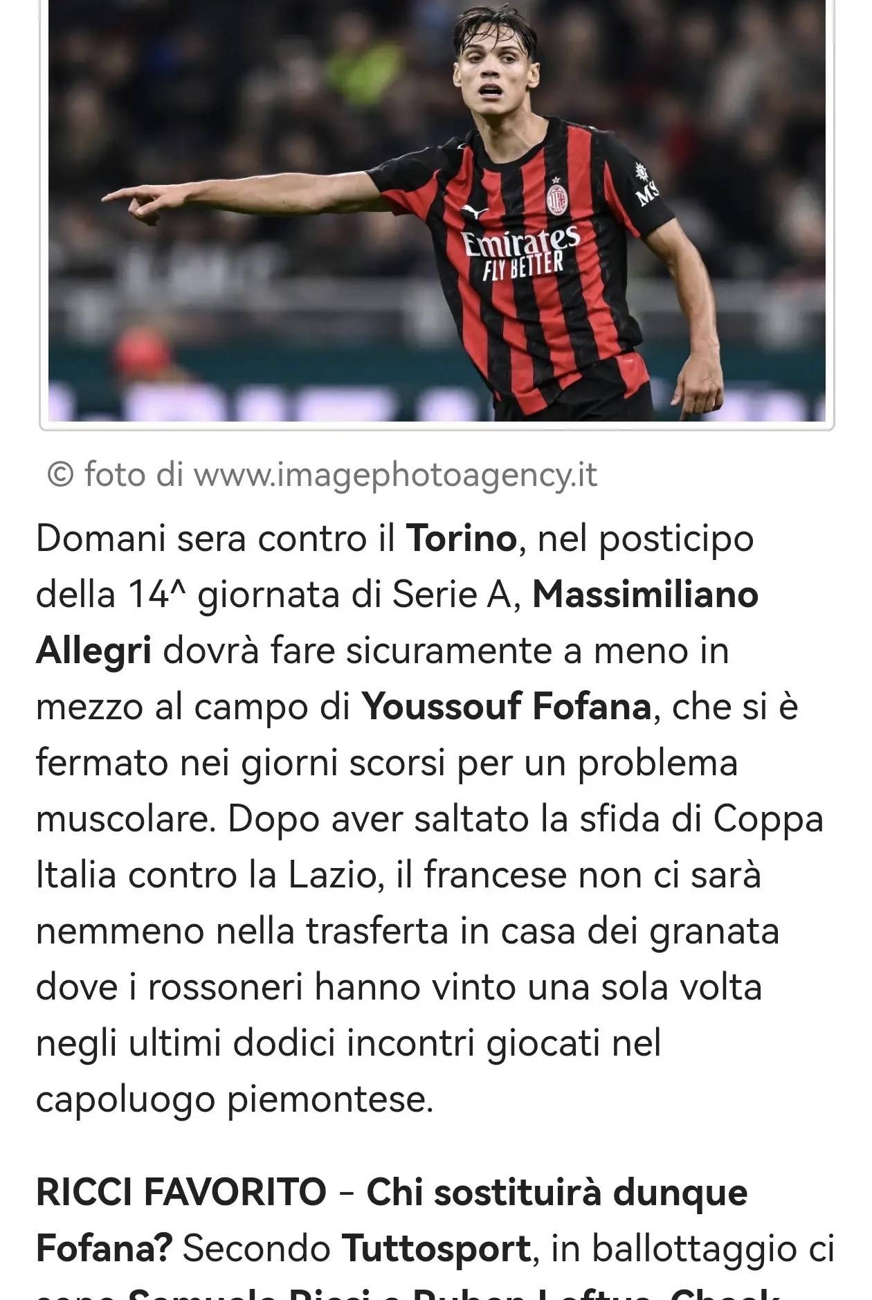มิลานจะพบกับโตริโน่ในรอบที่ 14 ของเซเรียอาในคืนวันพรุ่งนี้ โดยกองกลางของทีมภายใต้การคุมทีมของมัสซิมิเลียโน อัลเลกรีจะไม่มีโยสซูฟ โฟฟาน่าแน่นอน เนื่องจากนักเตะชาวฝรั่งเศสเพิ่งถูกพักการแข่งขันเนื่องจากอาการบาดเจ็บที่กล้ามเนื้อ