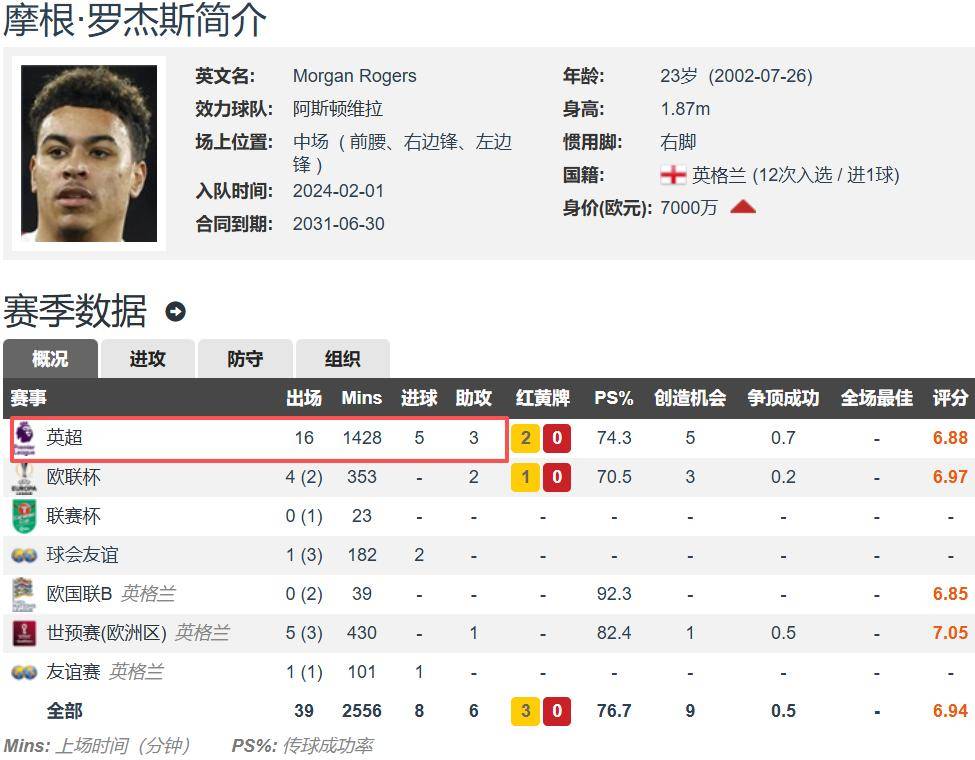 สถิติเปิดเผยว่า โรเจอร์ส วัย 23 ปี ได้ลงเล่นในพรีเมียร์ลีกครบทั้ง 16 นัดในฤดูกาลนี้ โดยมีส่วนร่วมในการทำประตู 5 ประตู และแอสซิสต์ 3 ครั้ง จำนวนประตูที่แท้จริงของเขาได้แซงหน้าค่าคาดการณ์ประตูของเขาไปแล้ว +3.12 ซึ่งถือเป็นตัวเลขสูงสุดในพรีเมียร์ลีกในระยะนี้ของฤดูกาล หากจะพูดให้ชัดเจน โรเจอร์ส มีทักษะการจบสกอร์ที่ยอดเยี่ยมเป็นพิเศษ โดยเฉพาะอย่างยิ่งจากระยะไกล สามารถเปลี่ยนโอกาสที่ไม่น่าเป็นไปได้ให้กลายเป็นประตูได้