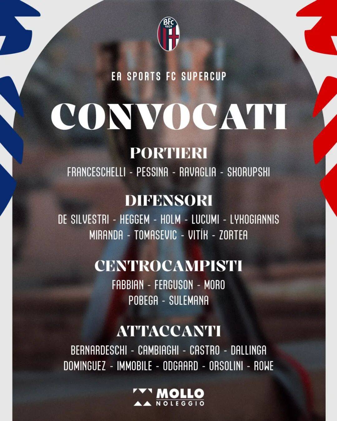 โบโลญญ่าคว้าสิทธิ์เข้าร่วมศึกซูเปอร์โคปปา อิตาเลียเป็นครั้งแรกในประวัติศาสตร์สโมสร หลังจากเอาชนะเอซี มิลานในรอบชิงชนะเลิศโคปปา อิตาเลียฤดูกาลที่ผ่านมา โดยคู่แข่งอย่างอินเตอร์ มิลานก็ถูกโบโลญญ่าเอาชนะมาแล้วเช่นกันในฤดูกาลที่แล้ว โดยทีมจากแคว้นเอมีเลีย-โรมัญญาเก็บได้ 4 คะแนนจาก 2 นัดในศึกกัลโช่ เซเรีย อา โดยเฉพาะชัยชนะในนัดที่ 33 ซึ่งหากมองย้อนกลับไป ถือเป็นจุดเปลี่ยนสำคัญที่ทำให้อินเตอร์พลาดแชมป์และจบฤดูกาลโดยมือเปล่าโบโลญญ่าต้อนรับการกลับมาของกองหลังชาวเช็ก มาร์ติน วิทิก สำหรับการแข่งขันนี้ ขณะที่อาการบาดเจ็บของลูกูมิดีขึ้นแล้ว เบลอตติได้รับการยืนยันว่าจะได้ลงเป็นตัวจริง มิดฟิลด์ชาวสวิส เรโม ฟรอยเลอร์ ผู้รักษาประตูชาวโปแลนด์ สกอร์ุปสกี้ และกองหลัง นิโคโล คาซาเล ยังคงพักรักษาอาการบาดเจ็บอยู่ การขาดหายไปของคาซาเลทำให้โบโลญญ่าต้องมองหาการเสริมทัพในแนวรับระหว่างตลาดซื้อขายนักเตะช่วงฤดูหนาว โดยมีเดอ ลิกต์ของอินเตอร์ มิลาน เป็นเป้าหมาย