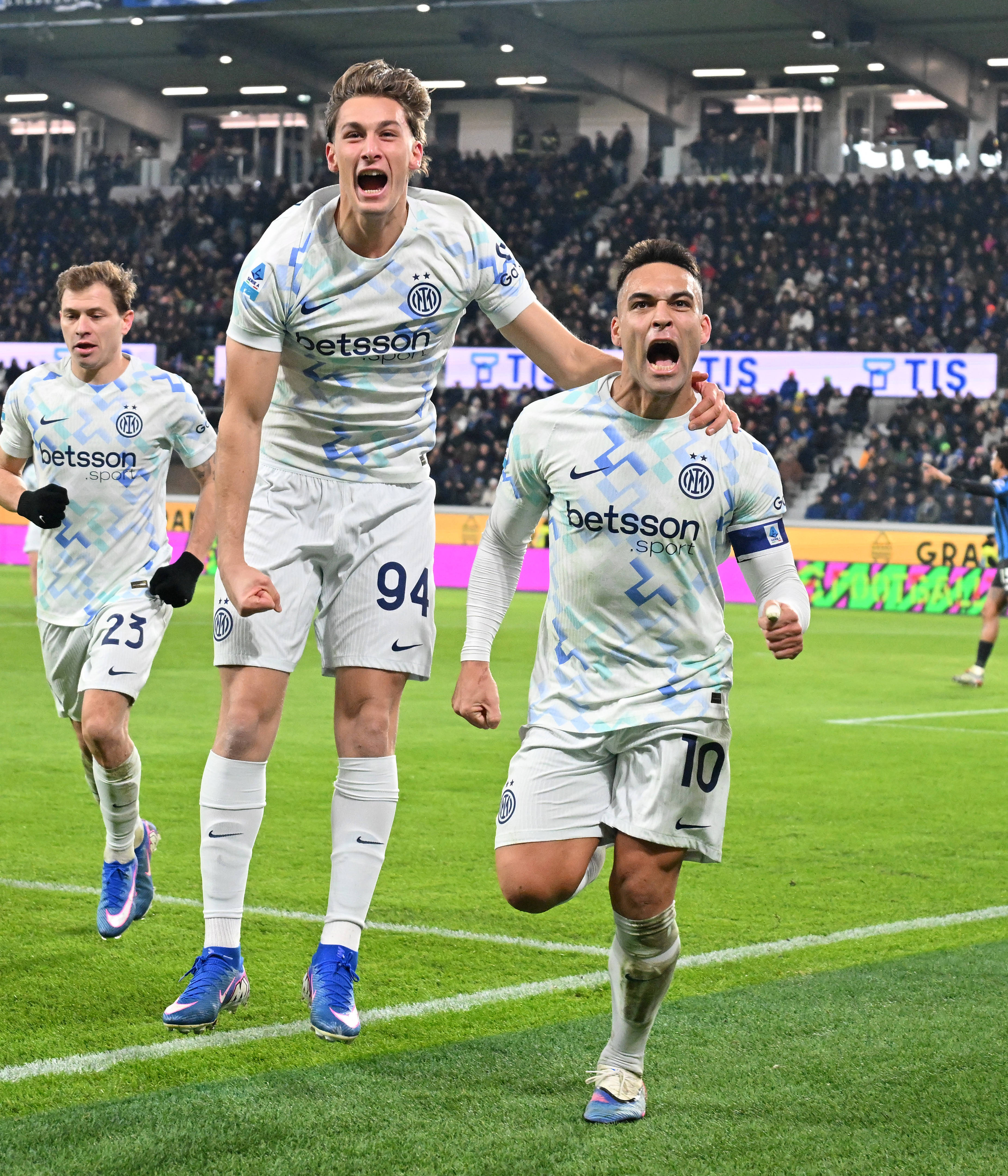เมื่อวันที่ 28 ธันวาคม นักเตะอินเตอร์ มิลาน ลาอูตาโร่ มาร์ติเนซ (ขวา) ฉลองประตูกับเพื่อนร่วมทีม เอสโปซิโต้ (กลาง) สำนักข่าวซินหัว (ภาพโดย อัลแบร์โต ลิงเกีย)