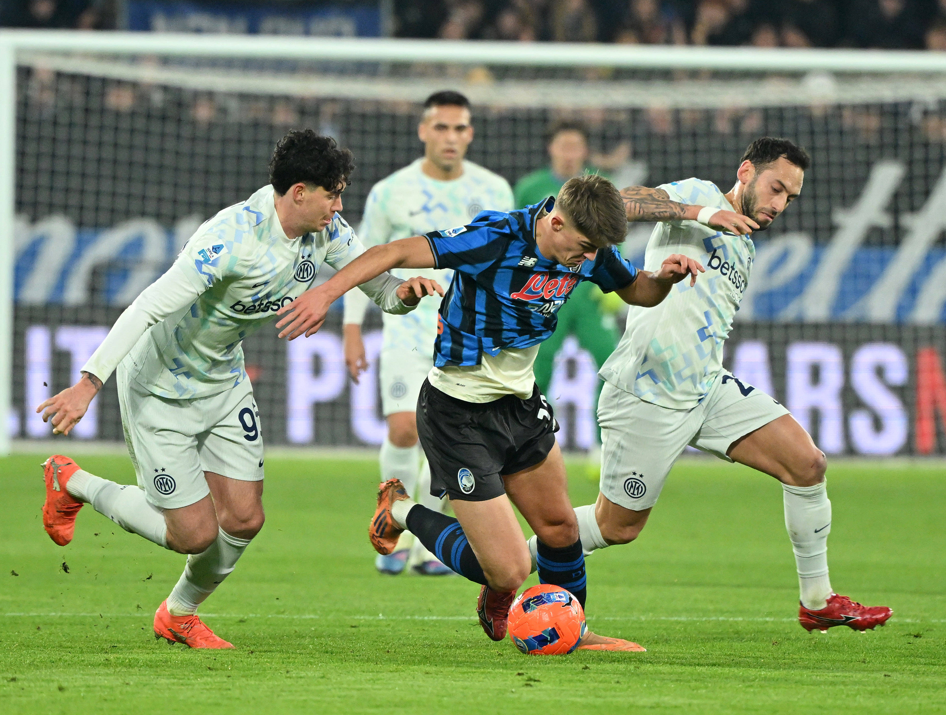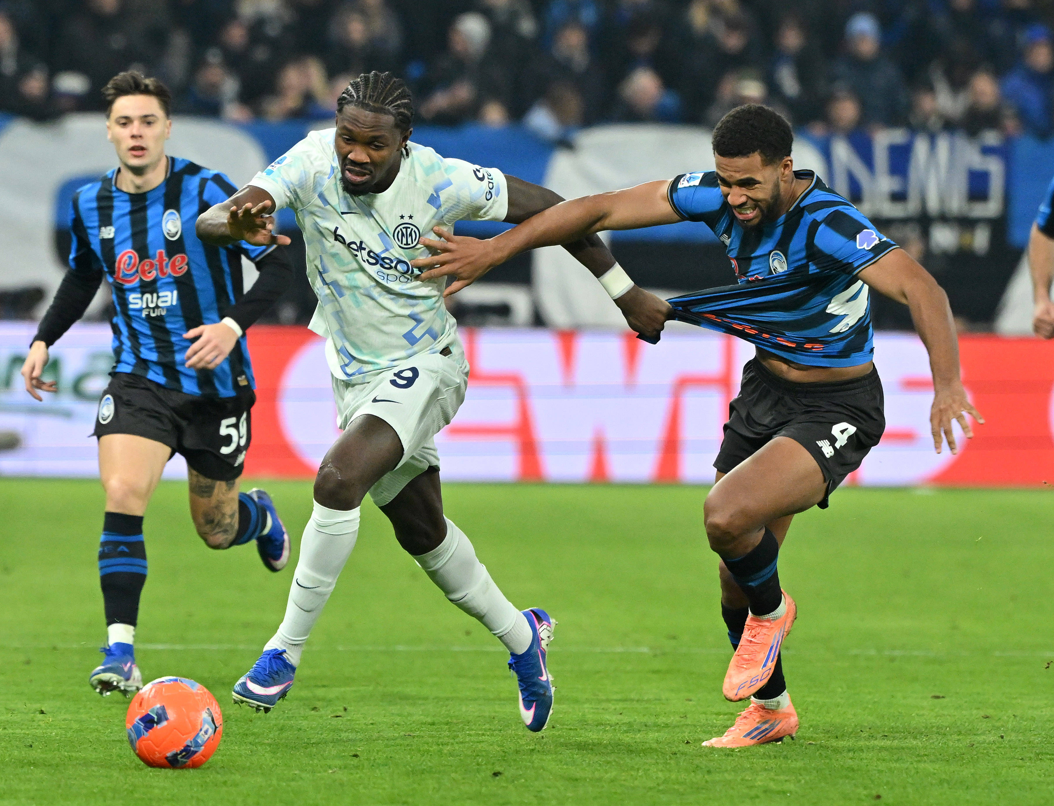 เมื่อวันที่ 28 ธันวาคม ผู้เล่นแอตแลนต้า เดอ เคเตลาเร (กลาง) ต่อสู้เพื่อแย่งบอลกับบาสโตนีของอินเตอร์ มิลาน (ซ้าย) และชัลฮาโนกลู ระหว่างการแข่งขัน สำนักข่าวซินหัว (ภาพโดย อัลแบร์โต ลิงเลีย)
