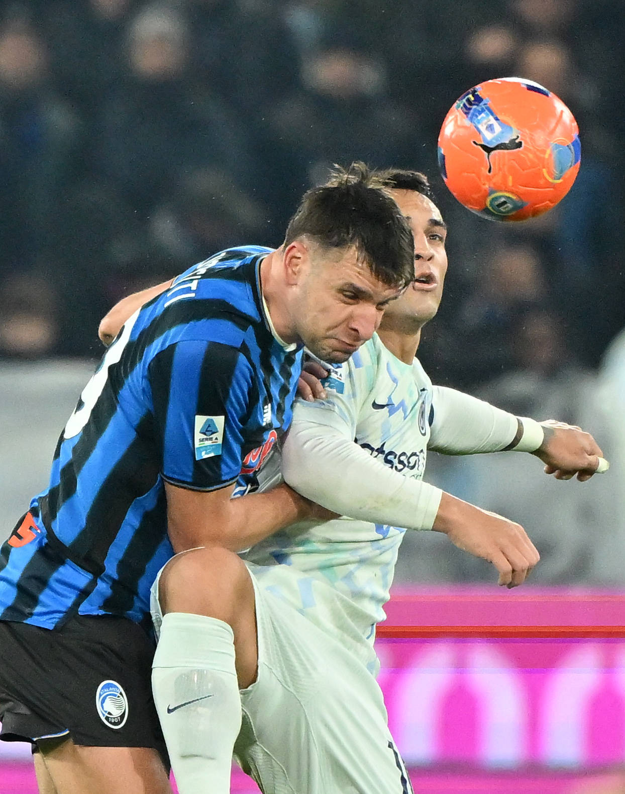 เมื่อวันที่ 28 ธันวาคม นักเตะอตาลันต้า จิม ซิติ (ซ้าย) ต่อสู้แย่งบอลกับเลาตาโร่ มาร์ติเนซ ของอินเตอร์ มิลาน ระหว่างการแข่งขัน สำนักข่าวซินหัว (ภาพโดย อัลแบร์โต ลิงเกีย)