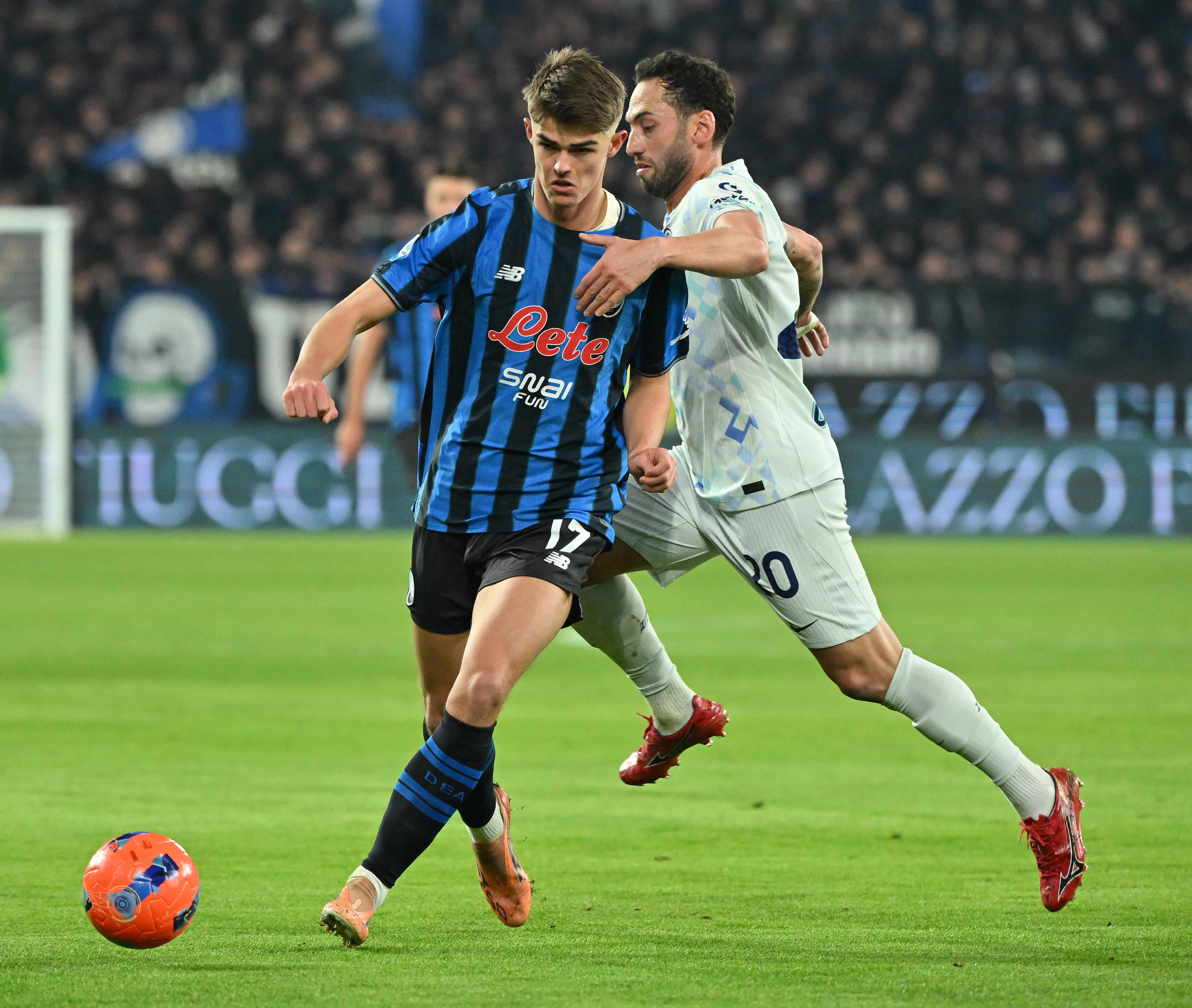 เมื่อวันที่ 28 ธันวาคม ผู้เล่นแอตแลนต้า เดอ เคเตลาเร (ซ้าย) ท้าทายกับ ชัลฮาโนกลู ของอินเตอร์ มิลาน ระหว่างการแข่งขัน สำนักข่าวซินหัว (ภาพโดย อัลแบร์โต ลิงเลีย)