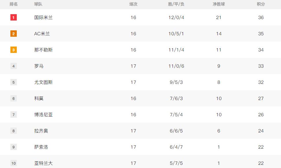 ปัจจุบัน ทีมสามอันดับแรกของเซเรียอาได้ลงเล่นน้อยกว่าทีมละหนึ่งนัดเนื่องจากโปรแกรมการแข่งขันซูเปอร์คัพของอิตาลี อินเตอร์ มิลาน นำเป็นจ่าฝูงด้วยคะแนนนำเพียงหนึ่งแต้ม โดยมีเอซี มิลาน และนาโปลี ตามมาติดๆ โรม่า อยู่ในอันดับที่สี่ ขณะที่ยูเวนตุส ซึ่งกำลังมีฟอร์มที่ดีขึ้นหลังจากการเปลี่ยนผู้จัดการทีม อยู่ในอันดับที่ห้า