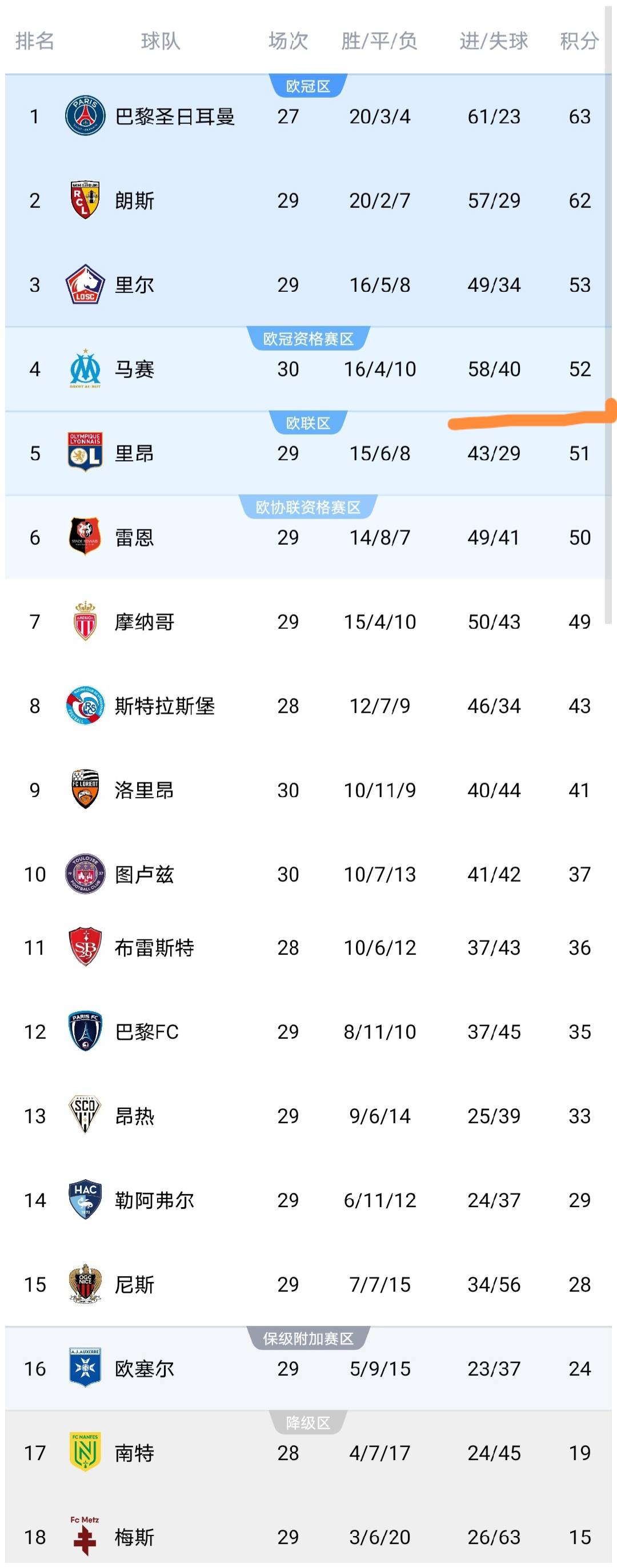 หลังการแข่งขัน ทีมมาร์กเซยยังคงรั้งอันดับ 4 ด้วยคะแนน 52 แต้ม ขณะที่ทีมลอเรียนยังคงรั้งอันดับ 9 ด้วย 41 คะแนน