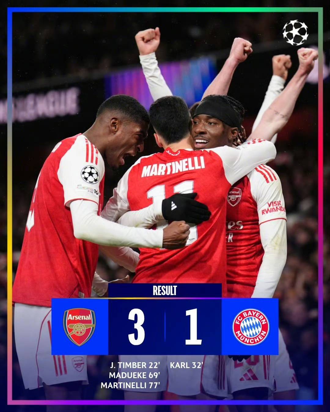 ด้วยชัยชนะ 5-3 ของปารีส แซงต์-แชร์กแมง เหนือท็อตแน่ม ฮ็อตสเปอร์ ซึ่งเป็นการปิดฉากการแข่งขันรอบที่ห้าภาพรวมล่าสุดของการผ่านเข้ารอบยูฟ่าแชมเปียนส์ลีกได้ปรากฏขึ้นแล้วอาร์เซนอลเอาชนะบาเยิร์น มิวนิค 3-1 ทำให้ทีมปืนใหญ่กลายเป็นทีมเดียวที่เก็บชัยชนะได้ครบทุกนัด ขึ้นนำเป็นจ่าฝูงของกลุ่ม ในบรรดาแปดทีมที่ผ่านเข้าสู่รอบน็อคเอาท์โดยตรง พรีเมียร์ลีกและบุนเดสลีกาต่างคว้าโควต้าทีมละสองทีม อันดับโดยรวมยังคงสูสีอย่างมาก โดยมีเพียงสองคะแนนเท่านั้นที่แบ่งอันดับสองถึงสิบ