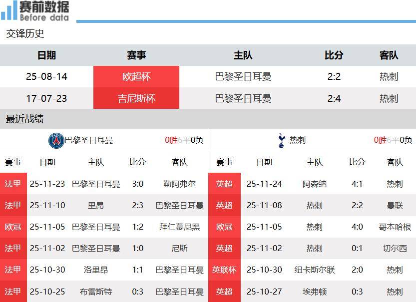 เวลา 04:00 น. ตามเวลาปักกิ่ง วันที่ 27 พฤศจิกายน การแข่งขันยูฟ่าแชมเปียนส์ลีก รอบแบ่งกลุ่ม นัดที่ 5 จะมีการแข่งขันที่น่าจับตามอง เมื่อปารีส แซงต์-แชร์กแมง เปิดบ้านต้อนรับการมาเยือนของท็อตแนม ฮ็อตสเปอร์