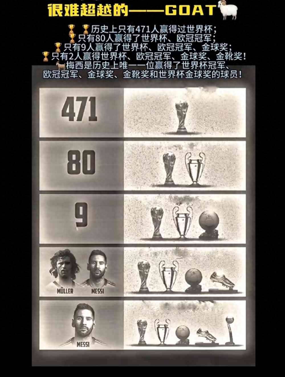 - 第五句话:足坛历史上只有梅西同时赢得世界杯冠军+欧冠冠军+金球奖+金靴奖+世界杯金球奖。