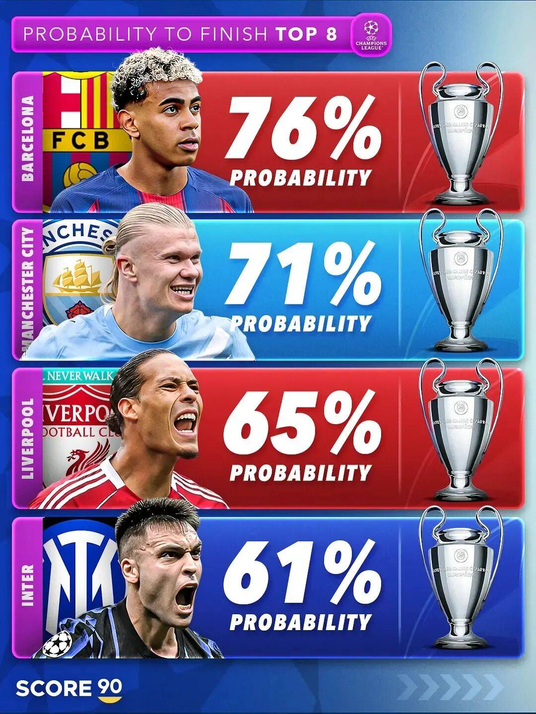 ตารางคะแนนจากอันดับหนึ่งถึงอันดับห้าเป็นดังนี้: ปารีส แซงต์-แชร์กแมง, บาเยิร์น มิวนิก, อินเตอร์ มิลาน, อาร์เซนอล และเรอัล มาดริด ซึ่งแทนลีก ลีกเอิง, บุนเดสลีกา, เซเรีย อา, พรีเมียร์ลีก และลาลีกา ตามลำดับ