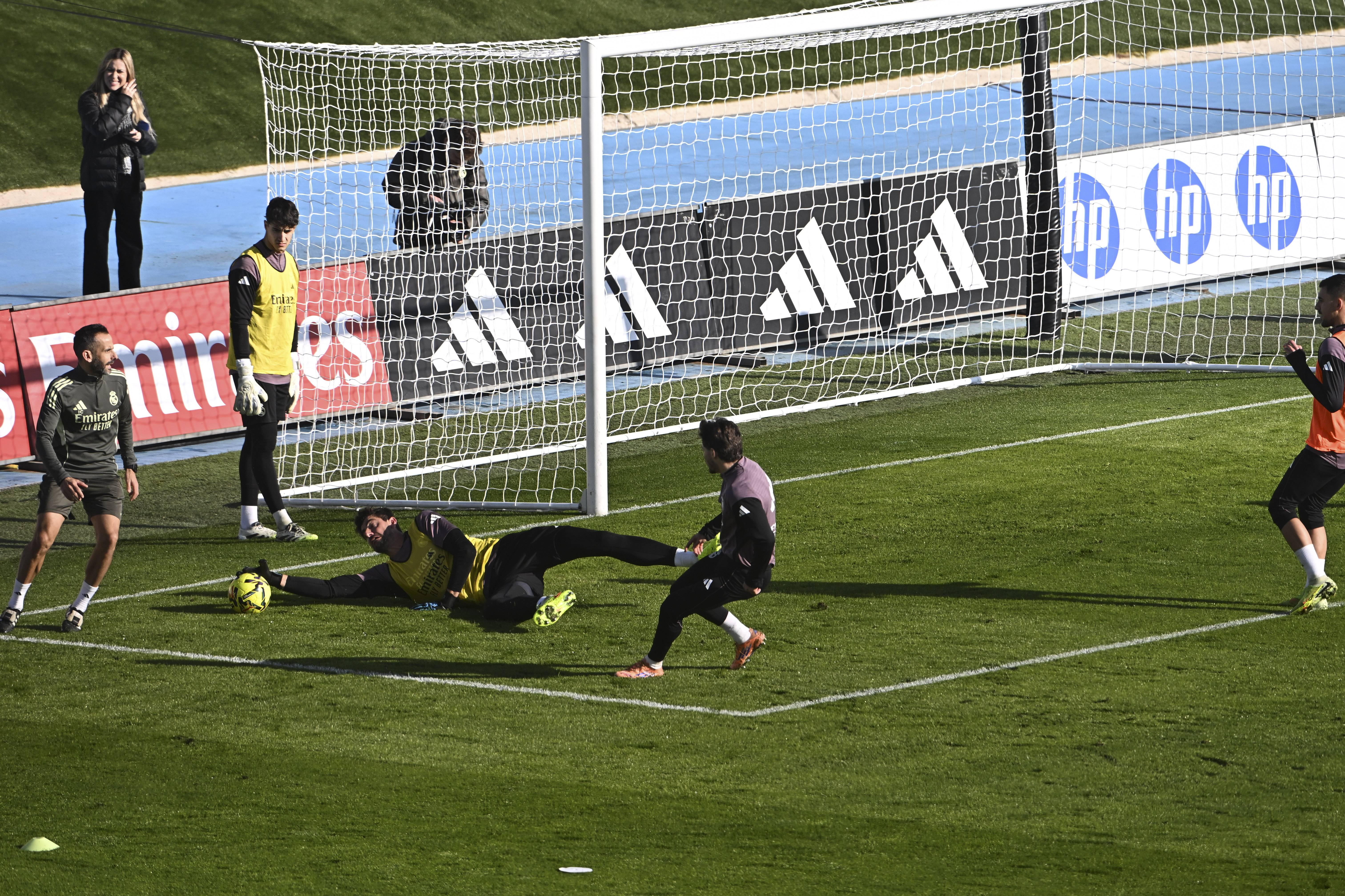 เมื่อวันที่ 30 ธันวาคม ผู้รักษาประตูของเรอัล มาดริด ธิโบต์ กูร์ตัวส์ (กลาง) ระหว่างการฝึกซ้อม. ชินหัว/อีพีเอ