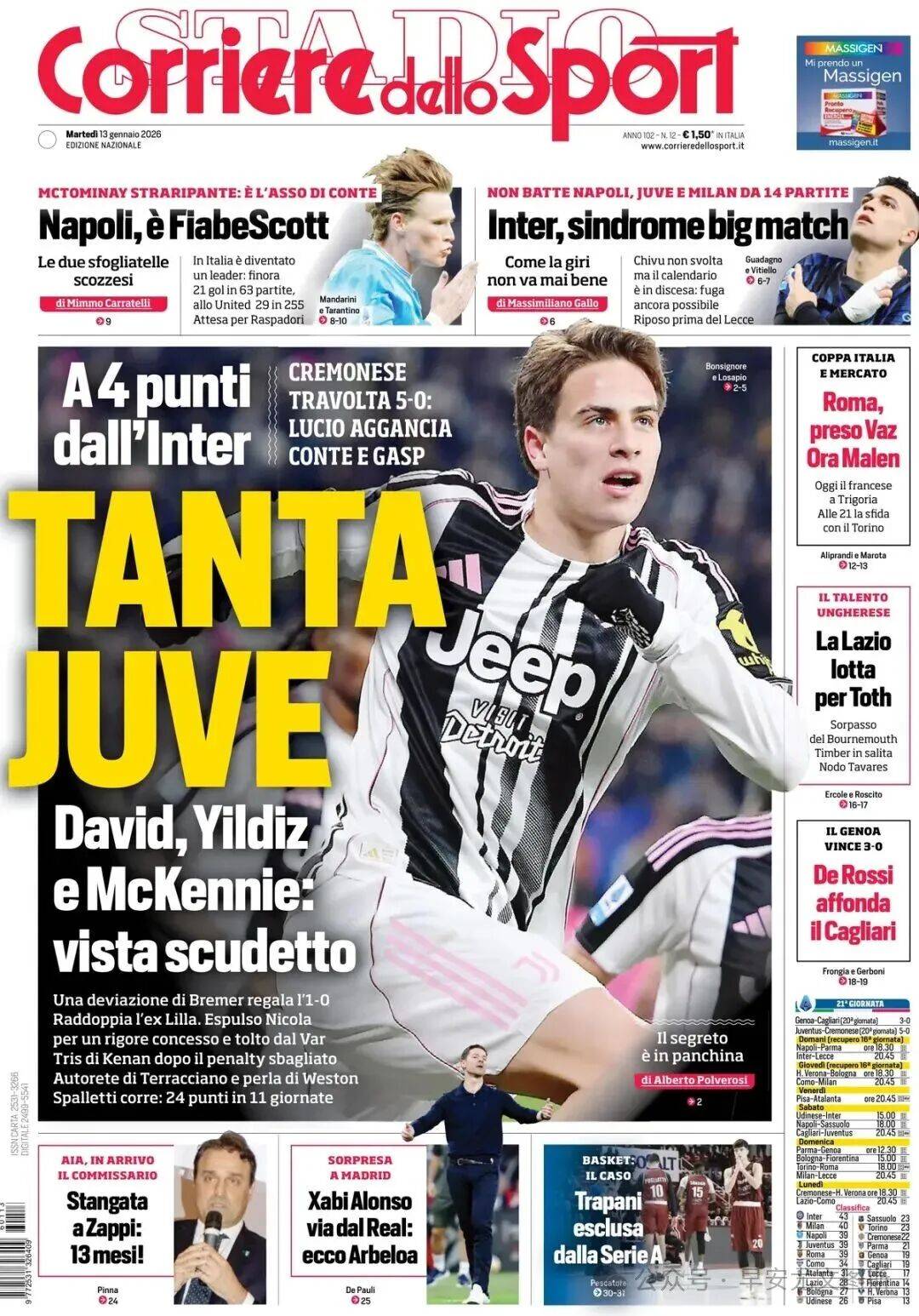 1. ยูเวนตุส คุณจะไม่มั่นใจได้อย่างไร? ชัยชนะ 5-0 เหนือเครโมเนเซ่ – สิ่งที่ไม่เคยเห็นในประเทศมานานถึงสิบปี.อยู่ในอันดับสามร่วมกับโรม่าและนาโปลี, ตามหลังจ่าฝูงเพียงสี่คะแนน, แฟนบอลกำลังฝันถึงแชมป์ลีก. ชนะห้าจากหกนัดล่าสุด:สไตล์และความมั่นใจ.ดูเหมือนว่าสถานการณ์จะเปลี่ยนไปแล้ว: ประตูโชคดีของเบรเมอร์, ดีบาล่ายิงอีกครั้ง, และจุดโทษที่เป่าให้จัลโลรอสซี่ถูกยกเลิก (นิโคล่าถูกไล่ออก)อิลดิซยิงจุดโทษซ้ำเข้าไป, เทอร์ราคเชียโนทำเข้าประตูตัวเอง, และแม็คเคนนีปิดท้ายชัยชนะ สปัลเล็ตติกล่าวว่า: "ผมได้ดูการปะทะระดับสูงระหว่างอินเตอร์ มิลานกับนาโปลี เรายังต้องพัฒนาอีกมาก แต่ถ้าเราเดินตามขั้นตอนนี้ เราสามารถประสบความสำเร็จได้"การเสริมทัพในแนวรับกำลังปรากฏขึ้น โดยมีมิงเกซเป็นผู้นำ