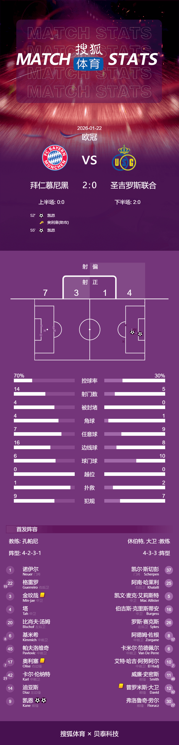 เวลา 04:00 น. ตามเวลาปักกิ่ง วันที่ 22 มกราคม บาเยิร์น มิวนิก เปิดบ้านต้อนรับการมาเยือนของแซงต์-กิลลัวส์ ในรอบที่ 7 ของกลุ่มการแข่งขันยูฟ่า แชมเปียนส์ลีก ฤดูกาล 2025-26ครึ่งแรกจบลงด้วยสกอร์ 0-0 โดยทั้งสองทีมเสมอกันในช่วงพักครึ่ง ในครึ่งหลัง แฮร์รี่ เคน ทำประตูได้สองครั้งภายในสามนาที จากนั้น คิม มิน-แจ ถูกไล่ออกจากสนามหลังจากได้รับใบเหลืองที่สอง เคนพลาดจุดโทษหลังจากนั้น ทำให้พลาดโอกาสทำแฮตทริก บาเยิร์นเอาชนะแซงต์-กิลลัวส์ 2-0 ในที่สุด หลังจากเจ็ดนัด พวกเขาชนะหกนัดและเสมอหนึ่งนัด เก็บได้ 18 คะแนน คว้าตำแหน่งในแปดอันดับแรกก่อนกำหนด