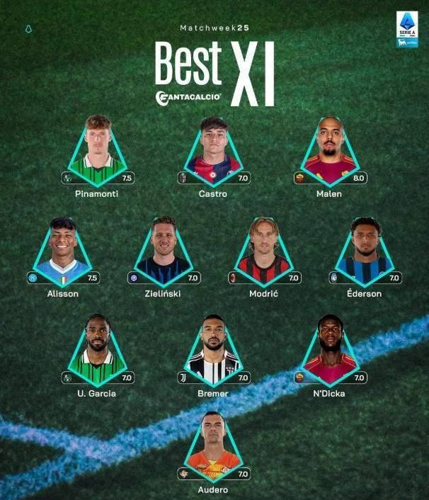 ลีกเซเรียอาได้ประกาศอย่างเป็นทางการเกี่ยวกับทีมยอดเยี่ยมประจำสัปดาห์สำหรับการแข่งขันนัดที่ 25 ซึ่งครอบคลุมตำแหน่งผู้รักษาประตู, กองหลัง, กองกลาง และกองหน้า การคัดเลือกที่สำคัญรวมถึงกองหลังที่โดดเด่นอย่างเบรเมอร์, กองกลางระดับมาสเตอร์อย่างลูก้า โมดริช, และกองกลางสารพัดประโยชน์อย่างปีโอเตอร์ ซีลินสกี้ รายชื่อเต็มทั้งหมดมีดังนี้: