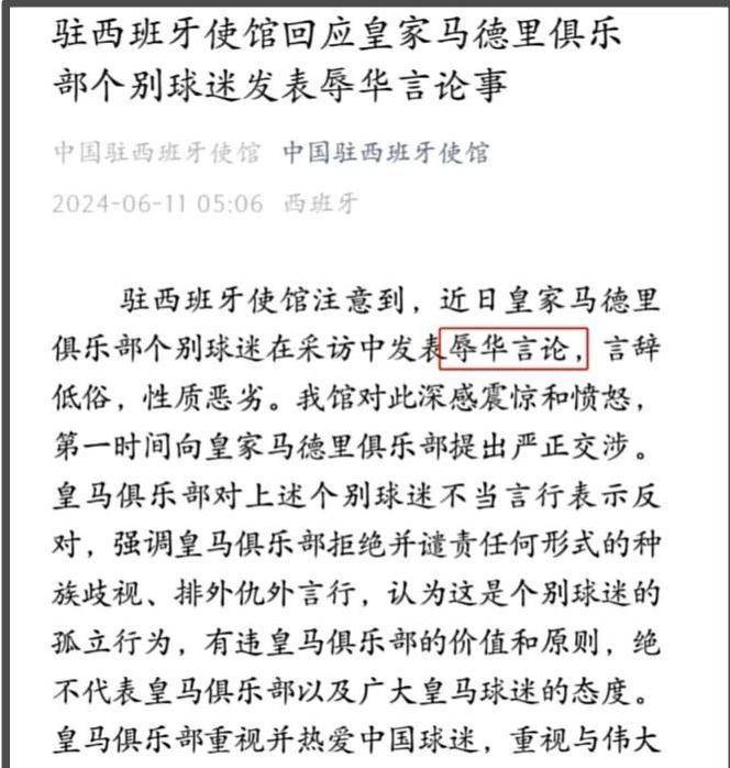 ในปี 2024 นักเขียนบล็อกกีฬาได้เข้าร่วมกิจกรรมที่เกี่ยวข้องกับเรอัล มาดริด และเมื่อถูกกระตุ้นจากแฟนบอลที่อยู่ในงาน ก็ได้ร้องเพลงที่ดูหมิ่นผู้หญิงชาวจีนเสียงดัง ต่อมา ชาวเน็ตได้ค้นพบข้อเท็จจริงที่น่าสนใจ: แฟนบอลเรอัล มาดริดที่เป็นผู้นำการร้องเพลงนั้น แท้จริงแล้วเป็นหลานชายของอดีตผู้บริหารระดับสูงของสโมสร ชื่อว่า โรดริโก ซานซ์