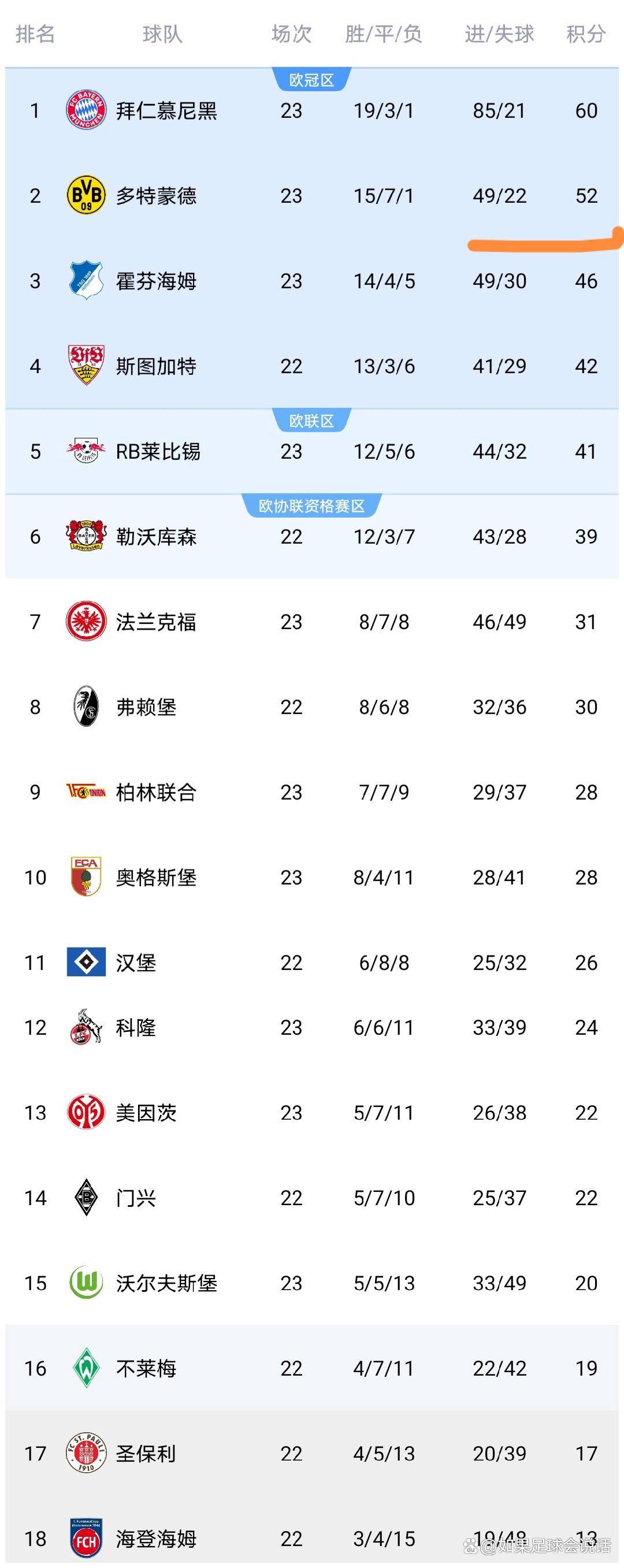 ตารางลีกปัจจุบันแสดงให้เห็นว่า บาเยิร์น มิวนิก นำเป็นจ่าฝูงด้วยคะแนน 60 คะแนน ขณะที่ โบรุสเซีย ดอร์ทมุนด์ ตามมาเป็นอันดับสองด้วยคะแนน 52 คะแนน ไรน์แบค ไลป์ซิก ได้ไต่ขึ้นมาอยู่อันดับห้าด้วยคะแนน 41 คะแนน ตามหลังสตุ๊ตการ์ตที่อยู่อันดับสี่เพียง 1 คะแนน