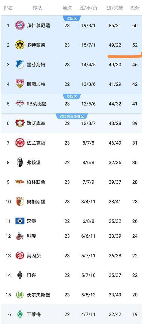 เมื่อการแข่งขันทั้งหมดเสร็จสิ้น ตารางคะแนนบุนเดสลีกาได้แสดงให้เห็นภาพที่ชัดเจนแล้ว บาเยิร์น มิวนิค นำเป็นจ่าฝูงด้วย 60 คะแนนจาก 23 นัด – ชนะ 19 นัด เสมอ 3 นัด และแพ้ 1 นัด – นำห่างทีมอื่นอย่างชัดเจน โบรุสเซีย ดอร์ทมุนด์ ลงเล่นน้อยกว่าหนึ่งนัด มี 51 คะแนนจาก 22 นัด ตามหลังอยู่ 8 คะแนน ฮอฟเฟ่นไฮม์ อยู่ในอันดับสามด้วย 46 คะแนน สตุ๊ตการ์ท อยู่ในอันดับสี่ด้วย 42 คะแนนRB ไลป์ซิก อยู่อันดับที่ห้าด้วย 41 คะแนน และไบเออร์ เลเวอร์คูเซ่น อยู่อันดับที่หกด้วย 39 คะแนน การแข่งขันเพื่อชิงตั๋วไปแชมเปียนส์ลีกได้กลายเป็นเรื่องที่ดุเดือดอย่างยิ่ง โดยคะแนนห่างกันเพียง 7 คะแนนจากอันดับที่สามถึงอันดับที่หก ไอน์ทรัค แฟรงค์เฟิร์ต อยู่อันดับที่เจ็ดด้วย 31 คะแนน ตามหลังโซนยุโรปอยู่ 8 คะแนน ในโซนตกชั้น ไฮเดนไฮม์ อยู่อันดับสุดท้ายด้วย 13 คะแนน ตามมาด้วย สตุ๊ตการ์ต ที่มี 17 คะแนน และแวร์เดอร์ เบรเมน ที่มี 19 คะแนน