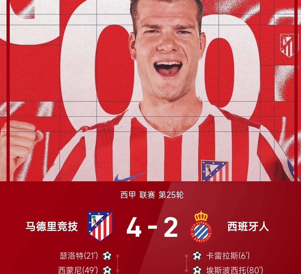 ในขณะเดียวกัน ที่อีกฟากหนึ่งของมาดริด แอตเลติโกได้ต้อนรับชัยชนะที่รอคอยมานานอย่างกึกก้องที่สนามเหย้าของพวกเขา วานดา เมโทรโปลิตาโน คู่แข่งของพวกเขาคือเอสปันญอล อย่างไรก็ตาม ช่วงเริ่มต้นกลับกลายเป็นฝันร้ายสำหรับทีมตราหมีภายในเวลาเพียงหกนาที เอสปันญอลได้เปิดเกมโต้กลับอย่างรวดเร็ว ดอรานส่งบอลข้ามจากฝั่งขวา บอลลอยข้ามแนวรับของแอตเลติโกทั้งหมด คาร์เรราสที่วิ่งมาที่เสาไกล ยิงบอลเข้าไปอย่างใจเย็นในตาข่ายที่ว่างเปล่า ทำให้เอสปันญอลขึ้นนำ 1-0 ในเกมเยือน
