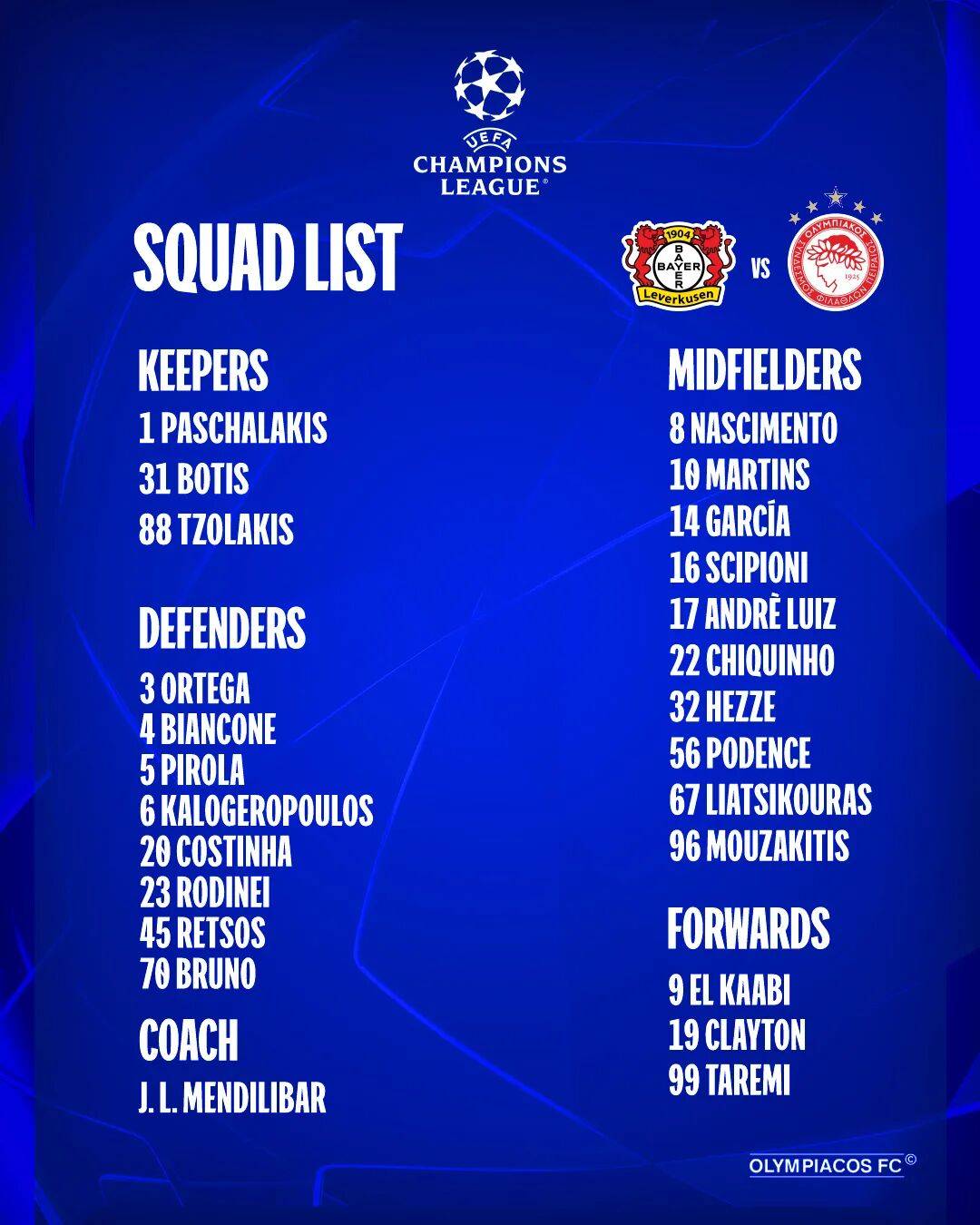 ยูฟ่า แชมเปียนส์ลีก: ไบเออร์ เลเวอร์คูเซ่น ได้และเสีย, โอลิมเปียกอส ส่งผู้เล่นเต็มทีม_เยือน_แมตช์ฤดูกาล