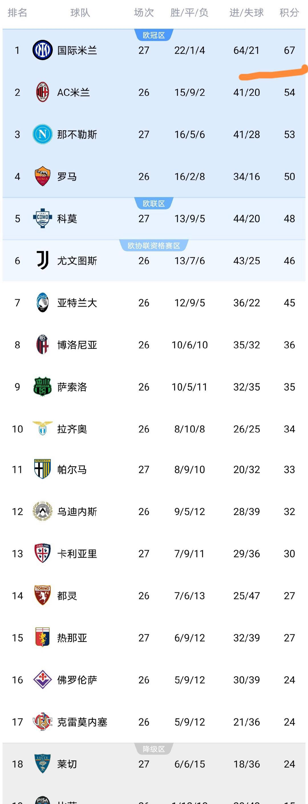 ผลการแข่งขันกัลโช่ เซเรีย อา นัดที่ 27: อินเตอร์ มิลาน คว้าตำแหน่งจ่าฝูง, โคโม และ นาโปลี ตามติด _การแข่งขัน_ _ตารางคะแนน_ _อินเตอร์ มิลาน_