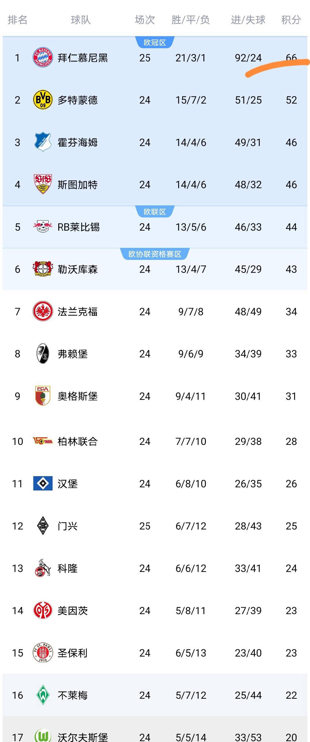 หลังจากแคมเปญนี้ บาเยิร์นมี 66 แต้มและได้อันดับหนึ่งในรายชื่อ และได้มากถึง 14 แต้มในอันดับที่ 2 ซึ่งเห็นได้ชัดว่าเป็นเทรนด์การขี่ฝุ่น ด้วยผลงานที่มั่นคงในปัจจุบันและความได้เปรียบอย่างท่วมท้น บาเยิร์นเกือบจะมั่นใจในการแข่งขันบุนเดสลีกาในฤดูกาลนี้
