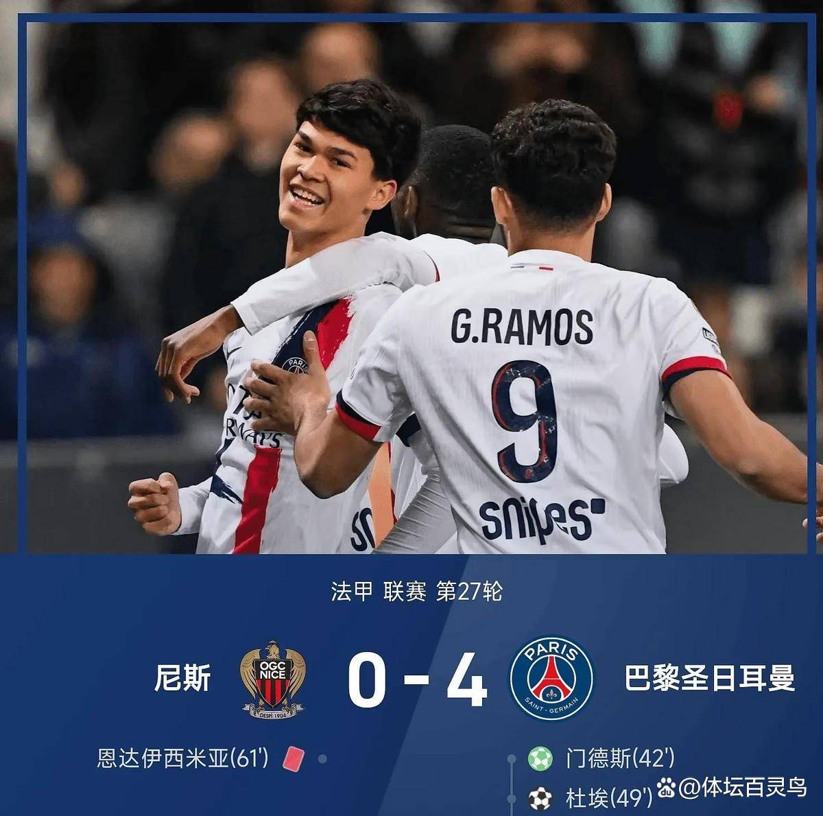 ในช่วงเช้าของวันที่ 22 มีนาคม ตามเวลาปักกิ่ง ในรอบที่ 27 ของลีกเอิง ปารีส แซงต์-แชร์กแมง ได้ไปเยือนสนามกีฬาอลิอันซ์ ริเวียร่า เพื่อท้าทายนีซ เกมเข้าสู่จังหวะปารีสตั้งแต่ต้น แม้ว่านีซจะพยายามต่อต้านที่บ้าน แต่พลังยิงที่น่ารังเกียจของปารีสก็พบความก้าวหน้าอย่างรวดเร็ว