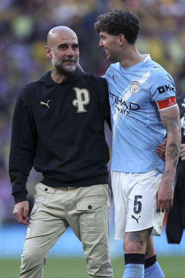 กวาร์ดิโอล่า (ซ้าย) พูดคุยและหัวเราะกับสโตนส์ กัปตันของเกม