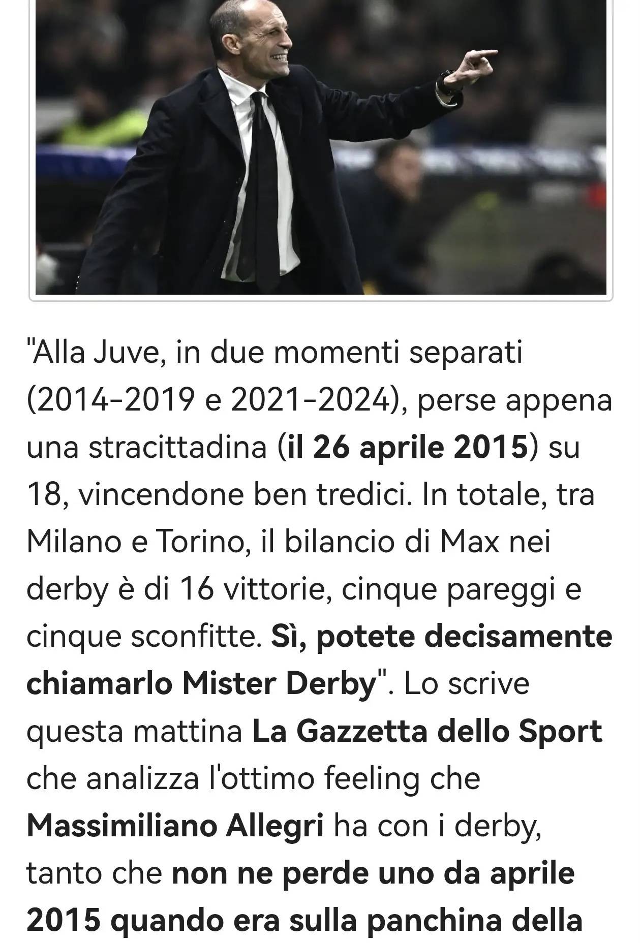ฉบับวันนี้ของ La Gazzetta dello Sport รายงานดังนี้ โดยวิเคราะห์สถิติที่น่าทึ่งของ มัสซิมิเลียโน่ อัลเลกรี ในเกมดาร์บี้ – นับตั้งแต่การพบกันในเดือนเมษายน 2015 ในช่วงที่เขาคุมทีมยูเวนตุส เขาไม่เคยพ่ายแพ้ในเกมดาร์บี้แห่งตูรินเลย