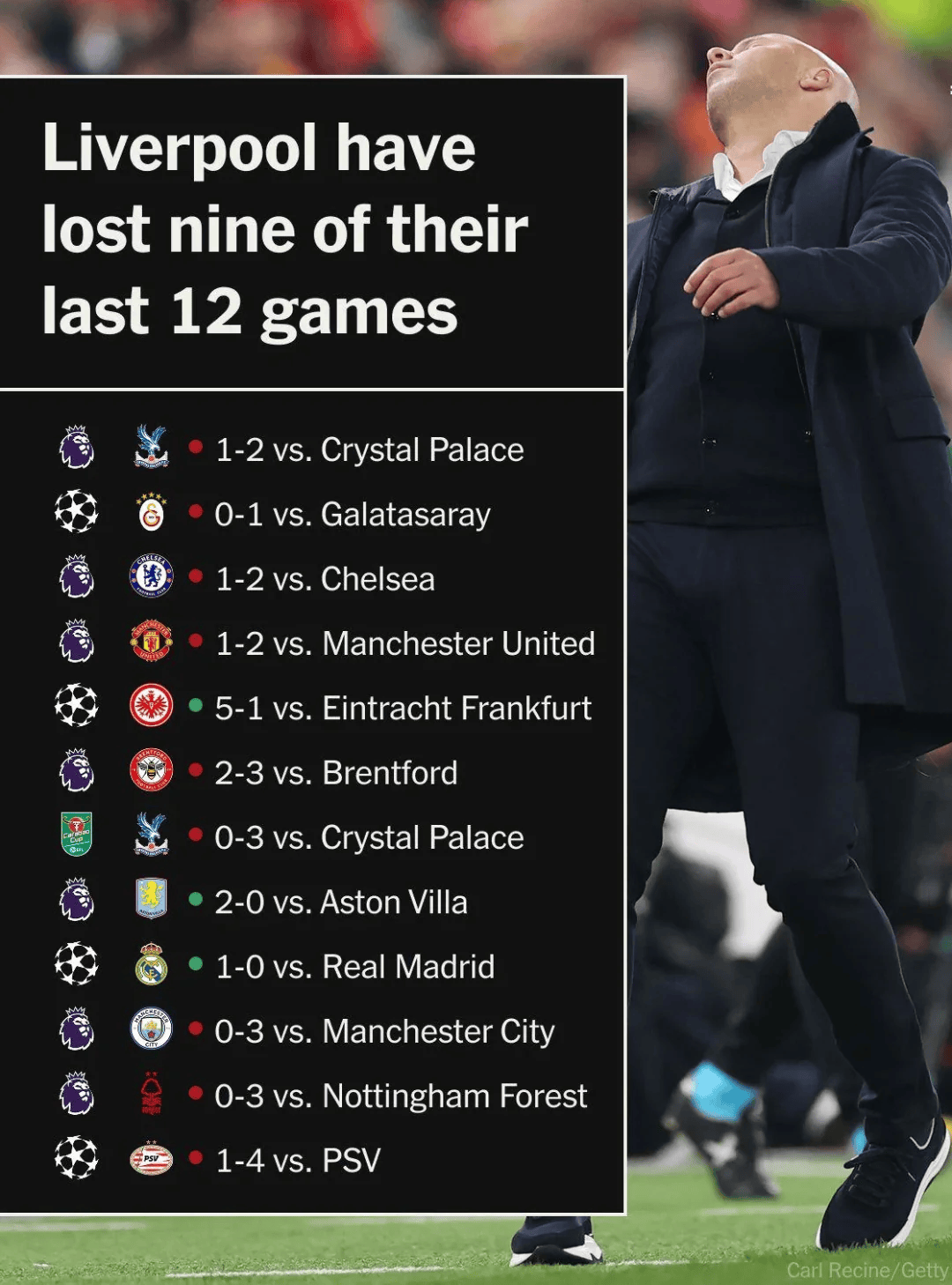 ตั้งแต่ปลายเดือนกันยายน ลิเวอร์พูลประสบความพ่ายแพ้ถึงเก้าครั้งจากสิบสองนัด ซึ่งรวมถึงการแพ้ติดต่อกันล่าสุดด้วยผลต่างสามประตูหรือมากกว่าต่อแมนเชสเตอร์ ซิตี้, น็อตติงแฮม ฟอเรสต์ และพีเอสวี ไอน์โฮเฟน