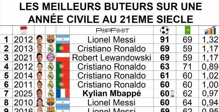 เมื่อมองย้อนกลับไปตลอดศตวรรษที่ 21 ตารางการทำประตูประจำปีแทบจะถูกครอบครองโดยคู่หูอย่างเมสซีและโรนัลโดอย่างแทบจะทั้งหมด ชื่อของพวกเขาเป็นดั่งสองดวงประทีปส่องสว่างบนท้องฟ้าแห่งวงการฟุตบอล ประตู 91 ลูกของเมสซีในปี 2012 ซึ่งได้รับการยกย่องว่าเป็นปาฏิหาริย์ในประวัติศาสตร์ฟุตบอล ดูเหมือนจะเป็นสิ่งที่แทบจะเป็นไปไม่ได้ที่จะทำซ้ำคริสเตียโน โรนัลโด ในขณะเดียวกัน ได้ติดอยู่ในสิบอันดับแรกของผู้ทำประตูสูงสุดในสี่ปีปฏิทิน: 69 ประตูในปี 2013, 63 ประตูในปี 2012, 61 ประตูในปี 2014, และ 60 ประตูในปี 2011 โรเบิร์ต เลวานดอฟสกี้ ได้ทำลายการผูกขาดของเมสซีและโรนัลโดในปี 2021 ด้วยการทำ 69 ประตู แสดงให้เห็นถึงประสิทธิภาพสูงสุดของกองหน้าตัวเป้าในยุคปัจจุบันขณะนี้ คีเลียน เอ็มบัปเป้ ทำประตูได้ 60 ประตูในปี 2025 ซึ่งทำให้เขาอยู่ในระดับเดียวกับสถิติของคริสเตียโน โรนัลโดในปี 2011 และผลงานของลิโอเนล เมสซีในปี 2010 รายการนี้แสดงให้เห็นอย่างชัดเจนถึงการพัฒนาของความสามารถในการทำประตูในวงการฟุตบอลในช่วงสองทศวรรษที่ผ่านมา – จากการแข่งขันระหว่างเมสซีและโรนัลโด สู่การปรากฏตัวของเลวานดอฟสกี้ในฐานะกำลังสำคัญ และตอนนี้การก้าวขึ้นมาอย่างน่าเกรงขามของเอ็มบัปเป้