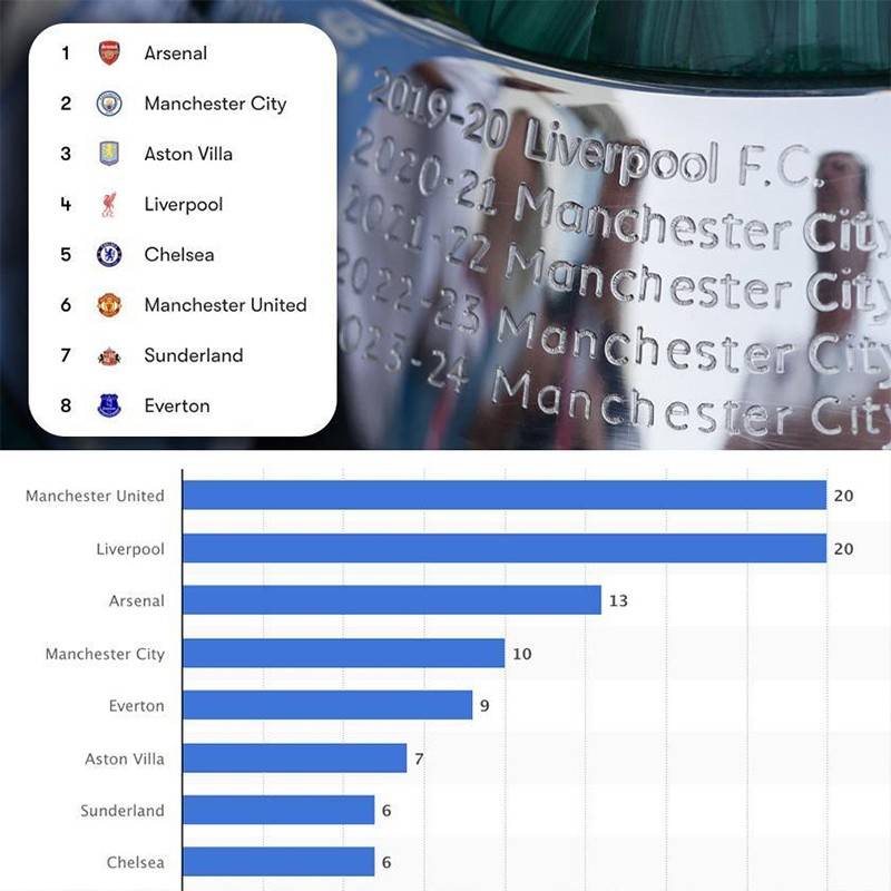 ปัจจุบัน ทีมแปดอันดับแรกในตารางพรีเมียร์ลีกตรงกับแปดสโมสรที่ประสบความสำเร็จมากที่สุดในประวัติศาสตร์ฟุตบอลอังกฤษอย่างแม่นยำ – นับเป็นความบังเอิญที่น่าทึ่งอย่างยิ่ง อย่างน้อยที่สุด แน่นอนว่าประวัติการคว้าแชมป์ของแต่ละทีมมีความแตกต่างกันแมนเชสเตอร์ ยูไนเต็ด ในฐานะมหาอำนาจแห่งยุคพรีเมียร์ลีก ร่วมกับแมนเชสเตอร์ ซิตี้ ที่สร้างผลงานอันน่าทึ่งด้วยการคว้าแชมป์ติดต่อกันสี่สมัย ได้ร่วมกันคว้าแชมป์ลีกมากกว่าครึ่งนับตั้งแต่ก่อตั้งขึ้นมา ในขณะเดียวกัน เจอร์เก้น คล็อปป์ และเวอร์จิล ฟาน ไดจ์ค ได้นำแชมป์พรีเมียร์ลีกสองสมัยมาสู่ลิเวอร์พูล ทำให้ทีมยักษ์ใหญ่จากดิวิชั่นหนึ่งในอดีตนี้หลีกเลี่ยงความอับอายอย่างหนักในยุคปัจจุบัน และในที่สุดก็ทำสถิติคว้าแชมป์เท่ากับแมนเชสเตอร์ ยูไนเต็ด