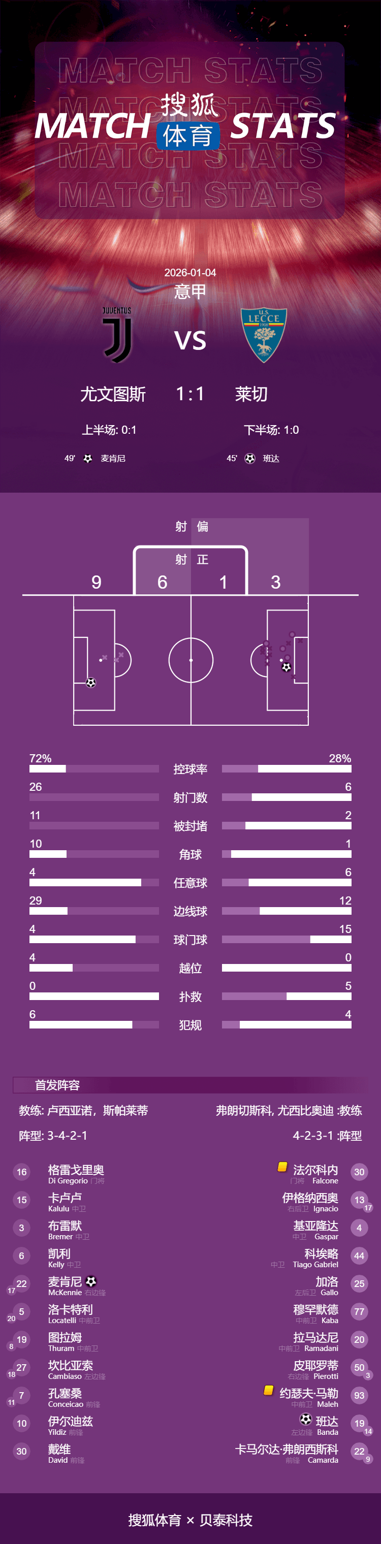 เวลา 01:00 น. ตามเวลาปักกิ่ง วันที่ 4 มกราคม 2026 ยูเวนตุสเปิดบ้านต้อนรับการมาเยือนของเลชเช่ ในรอบที่ 18 ของเซเรียอา บันดาทำประตูแรกให้กับเลชเช่ในครึ่งแรก ในครึ่งหลัง แม็คเคนนี่ทำประตูตีเสมอให้กับยูเวนตุส ขณะที่ดีบาล่าได้จุดโทษ แต่การยิงจุดโทษของเขาถูกผู้รักษาประตูเซฟไว้ได้ด้วยขา จบการแข่งขันด้วยผลเสมอ 1-1 ระหว่างยูเวนตุสและเลชเช่
